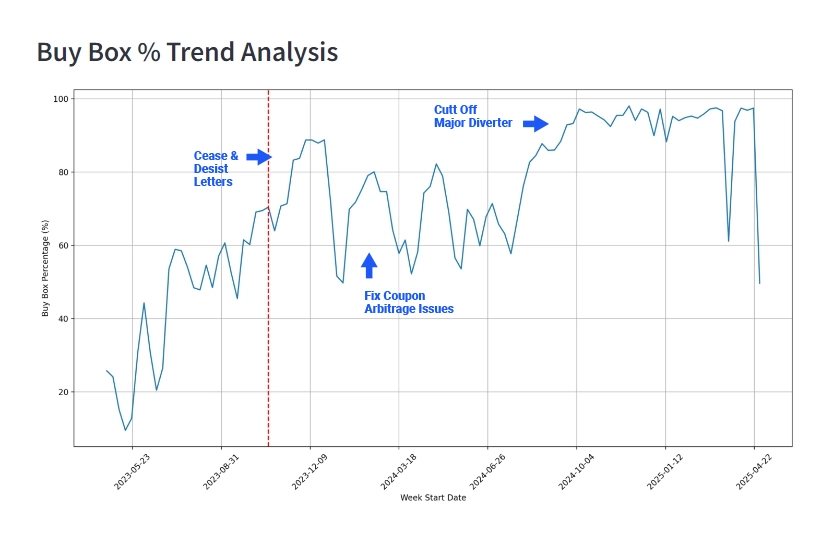 Following the red line—marking the beginning of Brand Alignment’s enforcement—Buy Box control skyrocketed and stabilized above 90%.